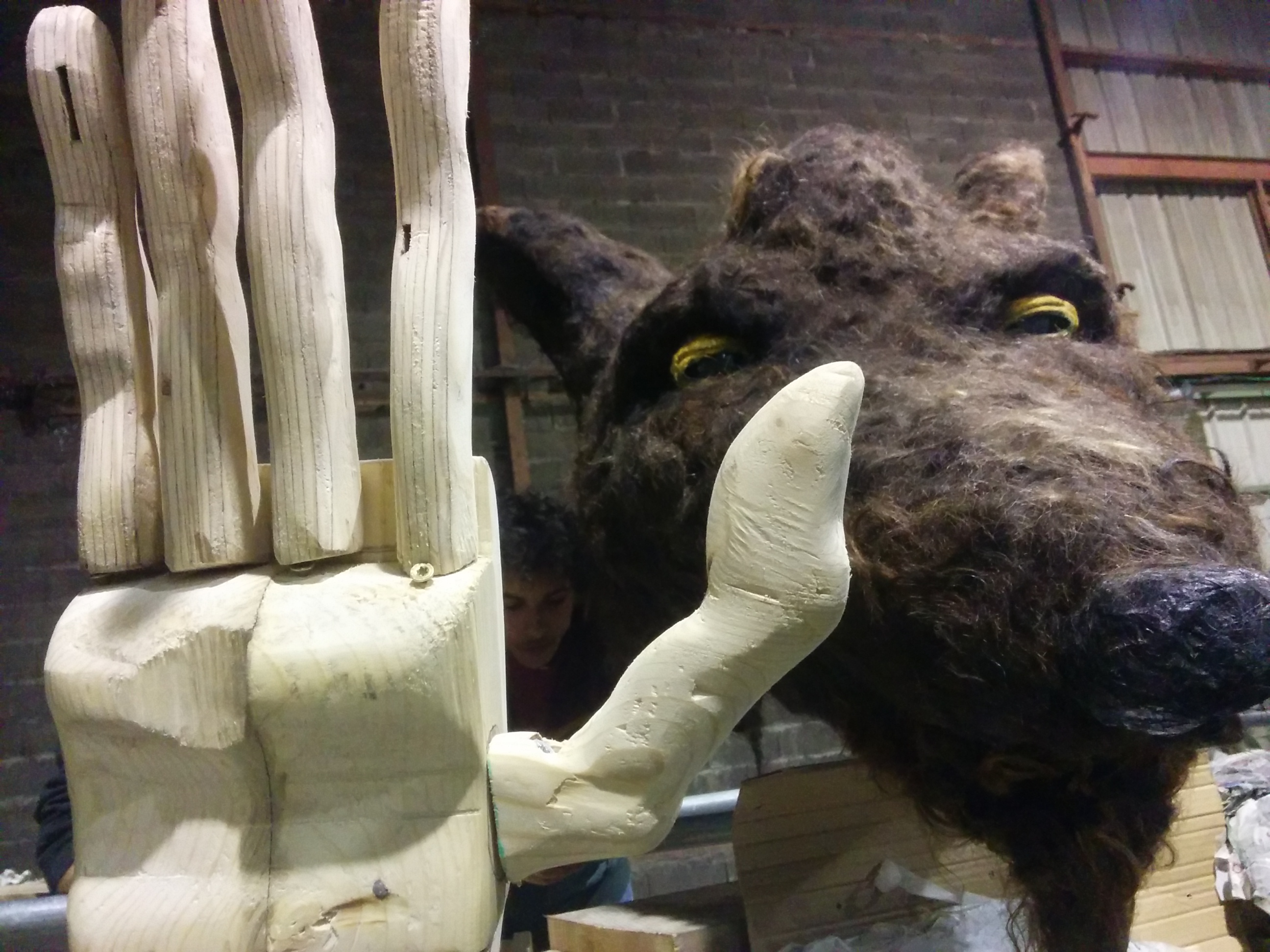 J’ai choisi un roi carnaval au corps d’homme et tête de loup qui salut la foule d’un air royal. Il représente l’hypocrisie de l’homme, un corps d’athlète très surfait, et un visage de loup avec un petit sourire sournois. Le salut royal est le symbole même de l’hypocrisie, le geste le plus naturel et le plus amical qui soit a été rendu aussi froid et distant que possible au travers d’un protocole strict. L’homme est devenu une machine, son bras est mécanique, sa tête est mécanique, son coeur est mécanique. Il sourit à la foule et, en même temps, par derrière il piétine les rêves et la créativité de l’homme.